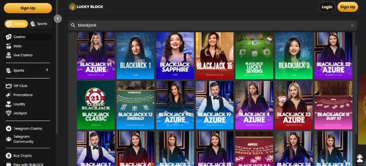 Lucky Block features 198 blackjack games. You can find provably fair games, electronic versions, and live dealer blackjack options among these. Several electronic games, like Blackjack Lucky Sevens and Blackjack Sapphire, are available for free play in demo mode. As a live casino, Lucky Block is equally impressive, featuring titles from top developers like Evolution Gaming.