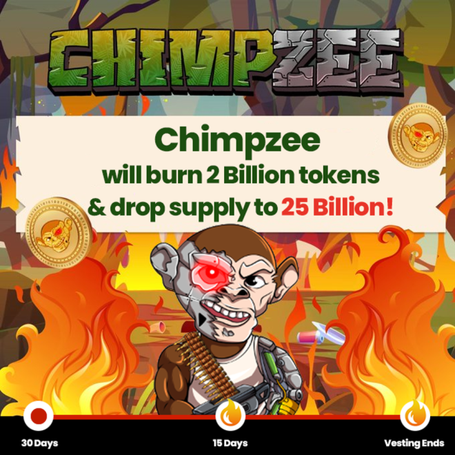 The initial 1 billion tokens will undergo burning at the 15-day mark, marking the halfway point of the vesting period. The remaining 1 billion will be burned at the conclusion of the vesting period. This approach serves as a rewarding gesture for all the Chimpzee investors who have supported the project thus far.