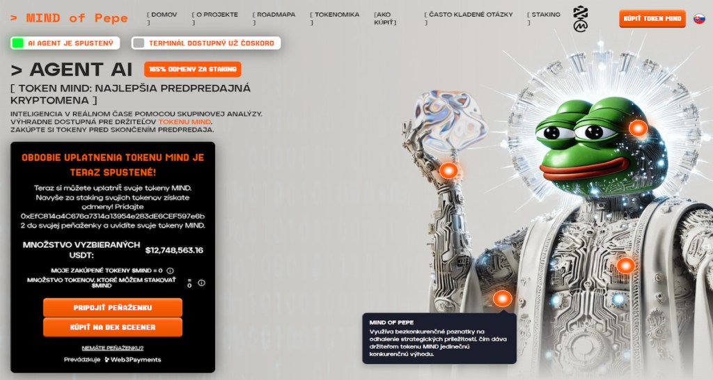 MIND of Pepe (MIND) spája svet meme coinov s umelou inteligenciou, čím vytvára nový a atraktívny príbeh v kryptopriestore. Inšpirovaný ikonickou postavičkou Pepe the Frog nie je len vtipným tokenom – je to celý pohyb s technologickým pozadím a silnou komunitou.