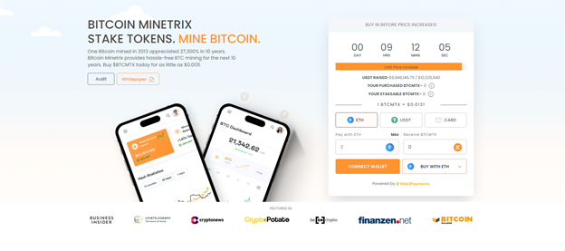 Bitcoin Minetrix is an emerging crypto platform that will go live with perfect timing. It’s a cloud-based BTC mining platform designed to make mining Bitcoin safe, simple, and accessible to the average user. Bitcoin Minetrix has a Stake-to-Mine reward system that allows users to earn nonfungible mining credits for renting out remote mining machines.