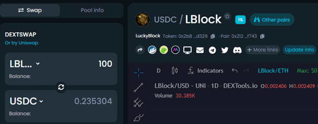 Afterward, head to DEXTools, press ‘Connect’, select MetaMask, and confirm the connection. Then, either convert ETH to USDC and search for USDC/LBLOCK or search for the WETH/LBLOCK pair. Next, simply enter the desired number of LBLOCK tokens and press ‘Trade’. The tokens will arrive in MetaMask promptly.