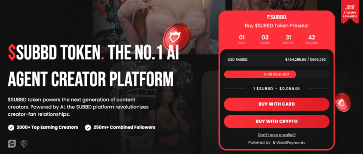 Token SUBBD je aktuálne dostupný len za 0,05545 $, no ďalšou predpredajnou fázou sa jeho cena zvýši. Svoje zásoby natívnych tokenov si môžete doplniť cez oficiálnu stránku projektu pomocou ETH, BNB, USDT alebo platobnou kartou.