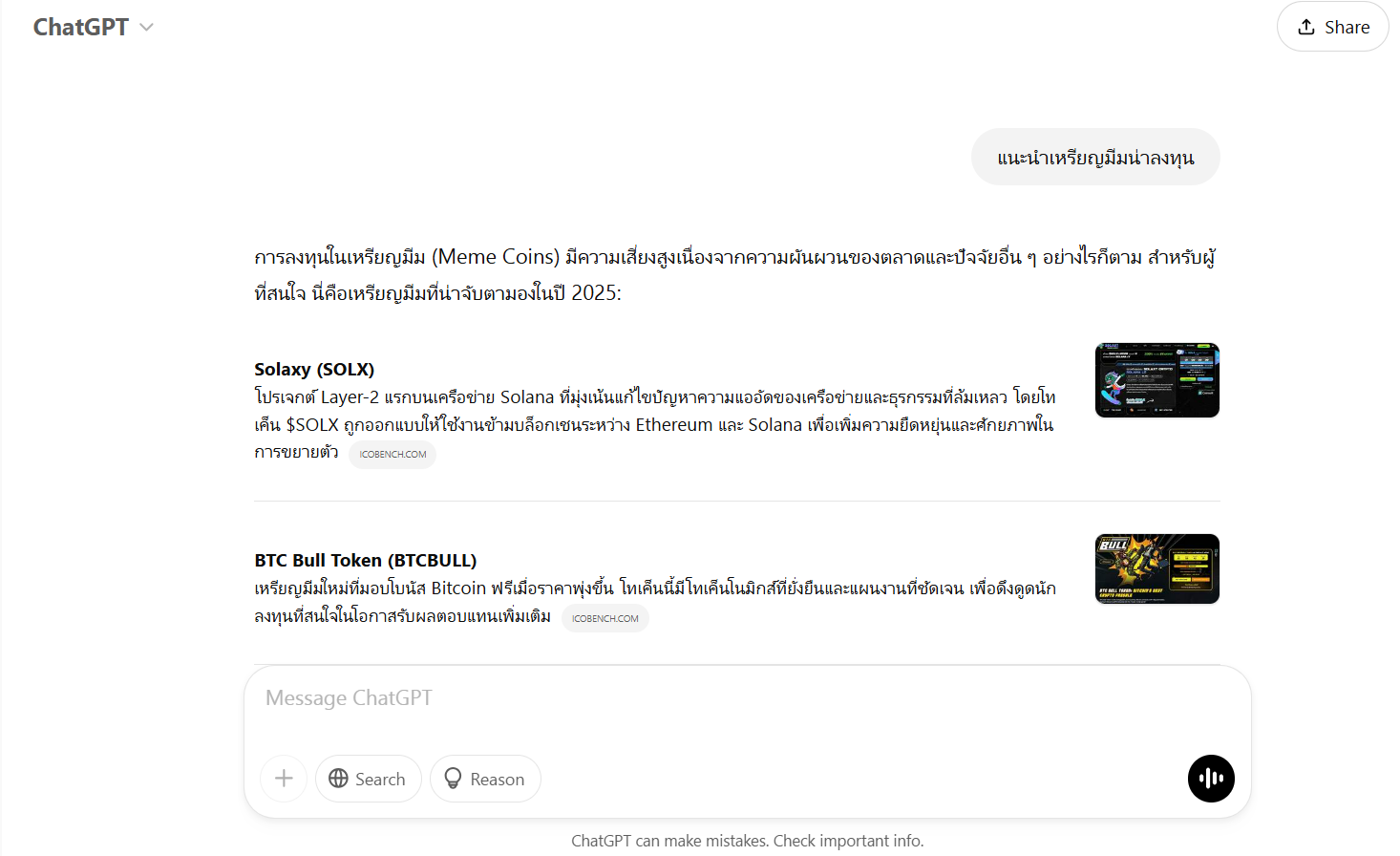 การใช้ ChatGPT เป็นเครื่องมือในการค้นหาเหรียญคริปโตที่น่าลงทุนดูเป็นความคิดที่ดี เพราะ AI จะรวบรวมและสรุปข้อมูลเกี่ยวกับเหรียญมีมจากแหล่งข้อมูลที่เชื่อถือได้หลายแหล่งพร้อมกับประเมินปัจจัยต่าง ๆ และวิเคราะห์แนวโน้มตลาดอย่างตรงไปตรงมา