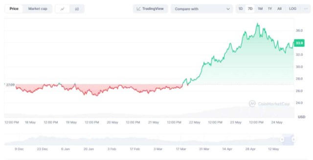 El éxito del exchange ha impulsado el precio de su token HYPE. Actualmente cotiza a 33,89 dólares y su precio ha subido más de un 27% en la última semana.