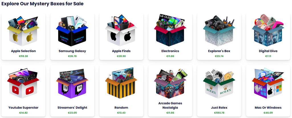 | Aanbod | >1.500 mystery boxes – o.a. tech, fashion, gaming. |