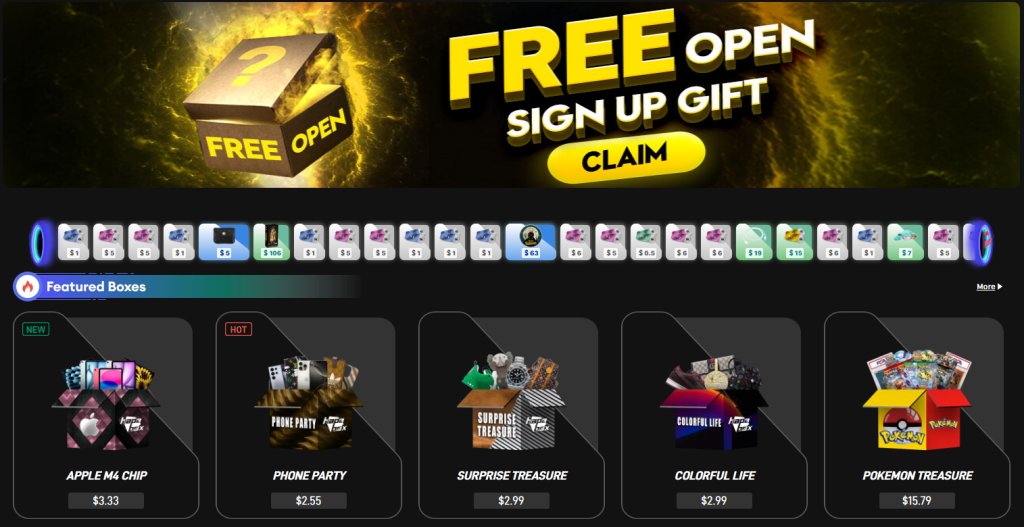 Onder mystery box fans is Boxy.gg een favoriet, mede door dagelijkse gratis winacties voor alle gebruikers. Elke 24 uur krijg je de mogelijkheid om een nieuwe gratis box te openen, iedereen profiteert dus van een kans op gratis prijzen, zonder inzet! Bij Boxy.gg kun je ook zelf custom mystery boxes maken en delen, en daarop weer een 3% commissie verdienen als anderen deze openen.