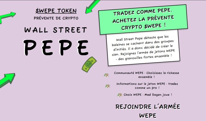 “Tradez comme Pepe, achetez WEPE !” : C’est le slogan de Wall Street Pepe et il résume en quelques mots le potentiel des meilleurs meme coins du moment.
