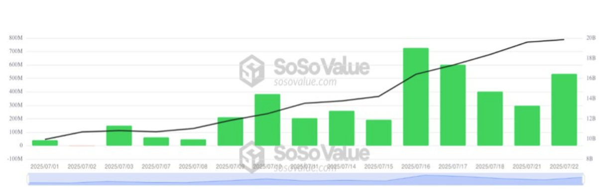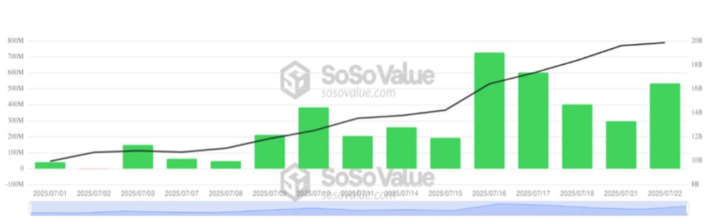 Un trend rafforzato anche dagli ETF Spot su Ethereum, che hanno registrato 16 giorni consecutivi di flussi netti positivi. Secondo la piattaforma di analisi on-chain Sentora (ex IntoTheBlock), dal 2 luglio a oggi, tra 7,5 e 8 miliardi di dollari sono confluiti nei fondi ETH quotati negli Stati Uniti. Un afflusso che ha spinto il totale degli asset in gestione ben oltre le stime iniziali, trasformando molti scettici in sostenitori convinti.