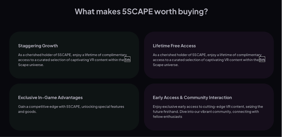 That explains the growing popularity of 5th Scape. The first-of-its-kind VR and AR project distinguishes itself within the crypto market with an ambitious vision, firmly rooted in the play-to-earn arena. It reshapes Web3 gaming by prioritising the gaming aspect over creating hype. Instead of merely offering captivating games, it aims to deliver an unparalleled gaming experience.