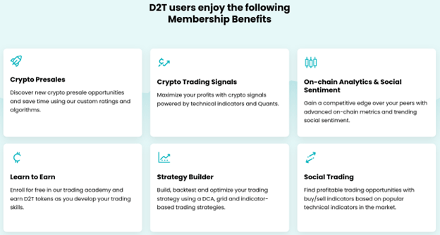 That is to say, holders of D2T crypto will have the option of copying the platform’s most successful traders. They can also choose to create their own DCA, grid, and other trading methods utilizing more than 10 advanced technical indicators.
