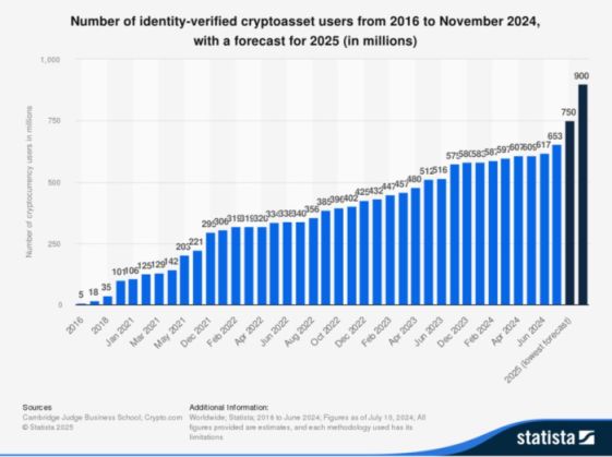 En novembre 2024, le nombre d’utilisateurs de portefeuilles crypto a atteint 653 millions, selon Statista. Il s’agit d’une hausse spectaculaire par rapport aux 5 millions d’utilisateurs en 2016, soit un taux de croissance annuel composé (CAGR) d’environ 178 %.