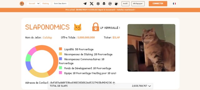 Au total, 9 milliards de $SLAP ont été émis sur le réseau ERC-20 à l’adresse 0x9ec9620e1fda9c1e57c46782bc3232903cacb59b. L’équipe fondatrice a évidemment partagé tous les détails de sa tokenomic sur le site officiel Catslaptoken.com pour offrir une grande transparence aux investisseurs.