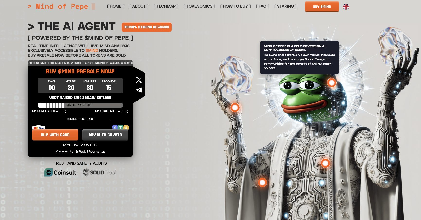 Mind of Pepe est tout simplement une intelligence artificielle capable de naviguer à travers le Web2 et le Web3, à l’avantage des holders de $MIND. En gérant la communication et le marketing du projet, en détectant des opportunités sur les marchés, en interagissant avec des dApps et en lançant des jetons lui-même, l’objectif est d’offrir un avantage considérable aux détenteurs de $MIND !