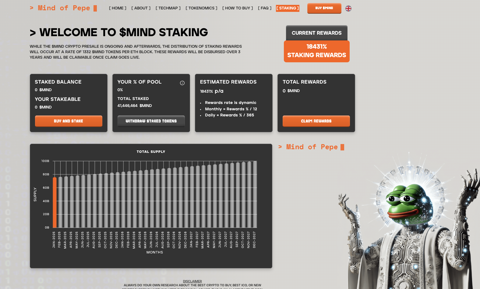 Il est possible dès maintenant de profiter d’une pool de staking sur le site officiel de la prévente Mind of Pepe ($MIND) pour accumuler des jetons tout au long de cette phase d’ICO. Étant donné que le projet vient tout juste d’être lancé, l’APY est actuellement à plus de 40 000 % ! Rendez-vous dans l’onglet « Staking » et placez le nombre de $MIND souhaité pour les faire travailler immédiatement.