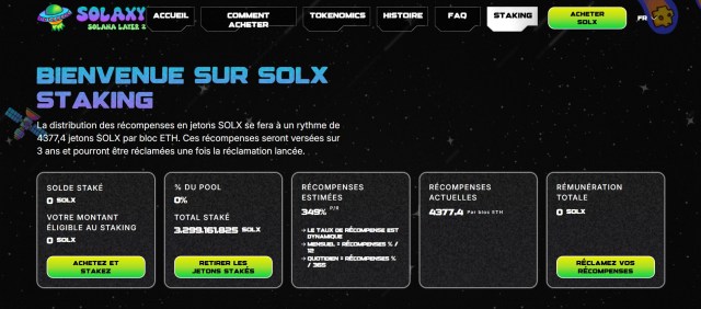 Dans un premier temps, le $SOLX est émis sur le réseau ERC-20 pour permettre aux premiers holders d’utiliser une pool de staking. Rendez-vous sur l’onglet dédié « Staking » depuis le site officiel et placez le nombre de tokens souhaités pour remporter jusqu’à 352 % d’APY en ce moment ! Évidemment, il s’agit de récompenses dynamiques qui peuvent être plus faibles en fonction du nombre de $SOLX placés en staking.