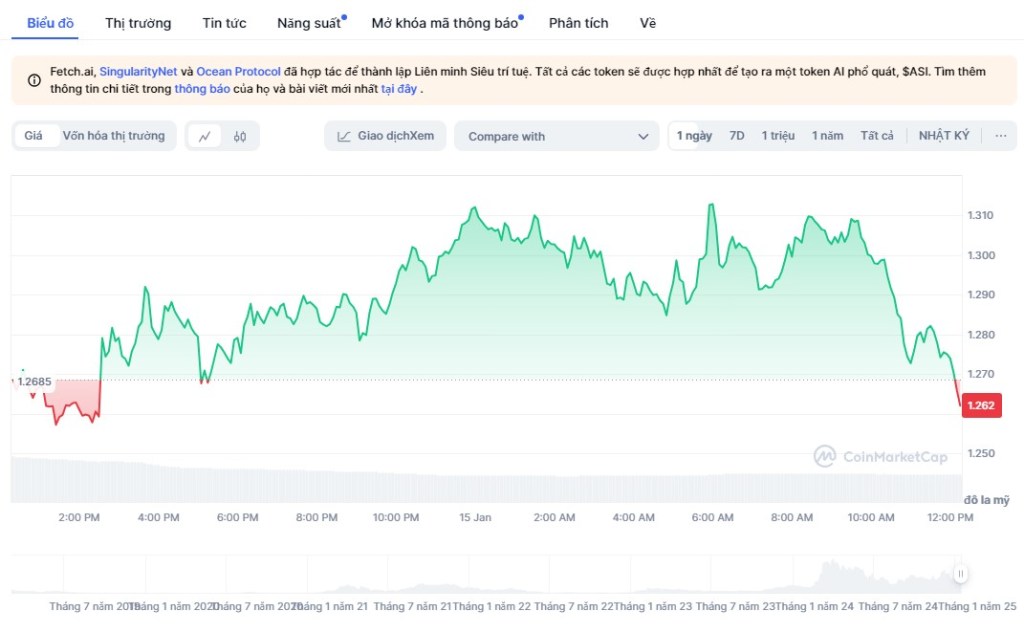 - Artificial Superintelligence Alliance ($FET): Một nền tảng dành cho phát triển AI. FET tập trung vào việc xây dựng một hệ sinh thái AI agent coin phi tập trung, nơi các nhà phát triển có thể cộng tác và chia sẻ tài nguyên để tạo ra các ứng dụng AI tiên tiến.