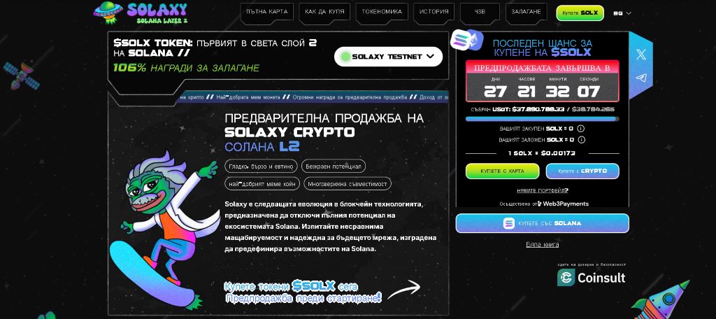 Solaxy съчетава страстта на технологичните ентусиасти с иновациите в света на криптовалутите, създавайки уникален сегмент на пазара. Общността расте, предварителната продажба е в разгара си, а планът за развитие обещава функции, които могат да променят правилата на играта.