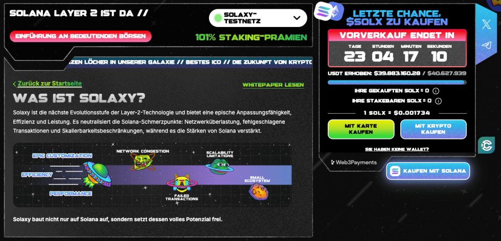 Um einen weiteren Presale-Coin mit 10x Potenzial könnte es sich indes auch bei SOLX handeln. Ähnlich wie BTCBULL befindet sich auch diese Altcoin heute noch ganz am Anfang ihrer Reise. Der Coin wurde noch nicht an Krypto-Börsen gelistet und ist derzeit ausschließlich über die offizielle Webseite des dahinter stehenden Projektes Solaxy erhältlich. Hier wird der Coin im Presale-Widget zum rabattierten Festpreis von 0,001734 $ verkauft, und bis heute kamen so bereits 39,8 Millionen $ an Presale-Funding zusammen.