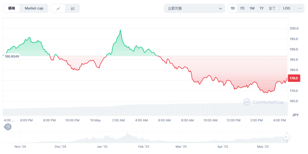 現在のモメンタムが維持されれば、次の目標価格は1.79ドル(約279円)、さらには2ドル(約312円)となる。強気の動きが続けば、2月の最高値に迫る展開も考えられる。