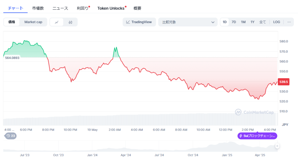 現在、SUIは過去最高値から28.7%下の水準にあり、今後のレジスタンスラインは4.24ドル(約662円)、4.75ドル(約742円)とされ、最終的には5.30ドル(約827円)を突破して新たな高値更新も視野に入る。