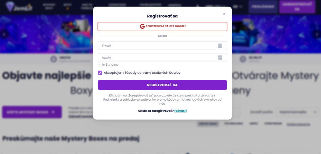 Pre začiatok je potrebné, aby ste si zriadili účet. Navštívte oficiálnu stránku JemLit alebo Boxy.gg a vyplňte požadované informácie ako emailová adresa a heslo. Registrácia je prvým a základným krokom, bez ktorého nemožno pokračovať v nákupe.