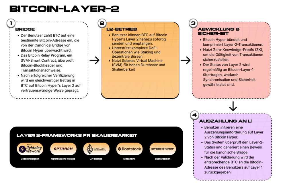 Der Grund für das hohe Interesse dürfte vor allem die Vision sein, die die Entwickler von Bitcoin Hyper verfolgen. Mit Bitcoin Hyper soll Bitcoin nähmlich sozusagen aufs nächste Level gehoben werden und seine erste eigene Layer-2 Blockchain bekommen. BTC ist inzwischen in Sachen Transaktionskosten und Transaktionsgeschwindigkeiten ja deutlich von der Konkurrenz überholt worden und eignet sich heute kaum noch für Micro-Payments oder die Nutzung im DeFi-Bereich für neue Projekte.