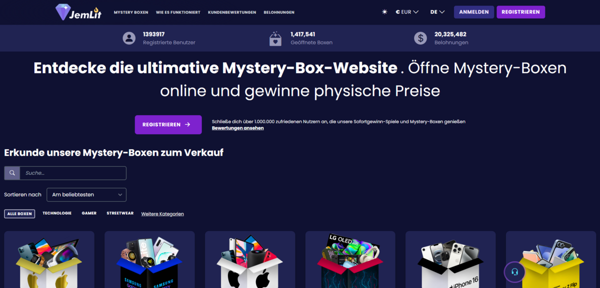 Am sichersten und bequemsten ist der Kauf über spezialisierte Mystery-Box-Websites. Eine der bekanntesten Plattformen ist Jemlit.com. Dort können Sie online eine Apple Mystery Box „öffnen“. Die Funktionsweise ist einfach: Sie wählen eine Box-Kategorie (z.B. Apple oder Technik) und bezahlen den angegebenen Preis. Anschließend wird virtuell ermittelt, welchen Preis Sie erhalten – das können verschiedene Apple-Produkte sein.