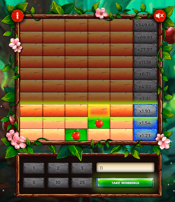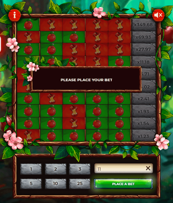 - المخاطرة لِمضاعفة الرهان – يستمر اللاعب في التقدم عبر المستويات لتحقيق مضاعفات أعلى، مع تحمل مخاطر أكبر. عند الوصول إلى المستوى الثامن، ينخفض عدد التفاحات السليمة إلى 2 ممّا يدلّ على نسبة مخاطرة عالية.