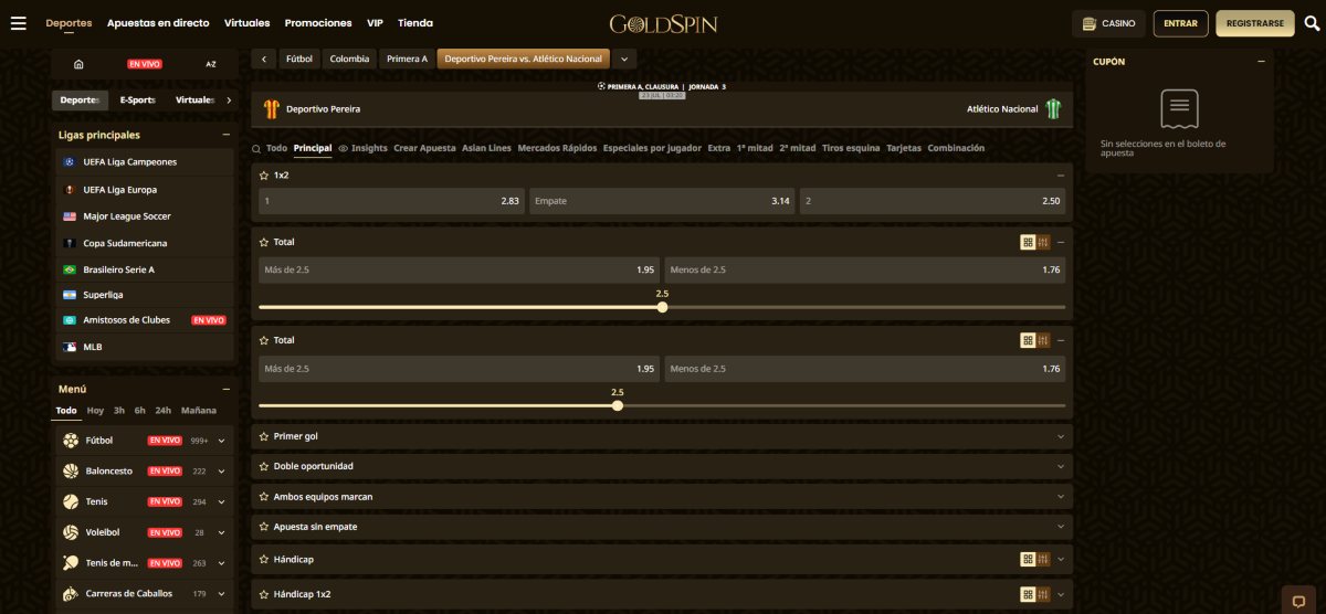 Para quienes buscan dinamismo, el mercado de goles es una opción muy entretenida. La apuesta consiste en adivinar si el número total de goles en el partido superará o no una cifra preestablecida. Por ejemplo, una apuesta “Over 2.5” significa que esperas al menos tres goles durante el juego, mientras que un “Under 2.5” indica que el encuentro terminará con un máximo de dos tantos.
