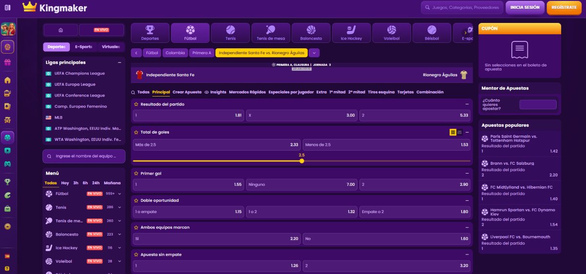 Este mercado es directo y emocionante: simplemente debes pronosticar si los dos equipos anotarán al menos un gol durante el partido. Por ejemplo, en un duelo entre América de Cali y Deportivo Pasto, puedes apostar a que ambos marcan si prevés un partido abierto, o a que no lo harán si esperas un choque cerrado y táctico.