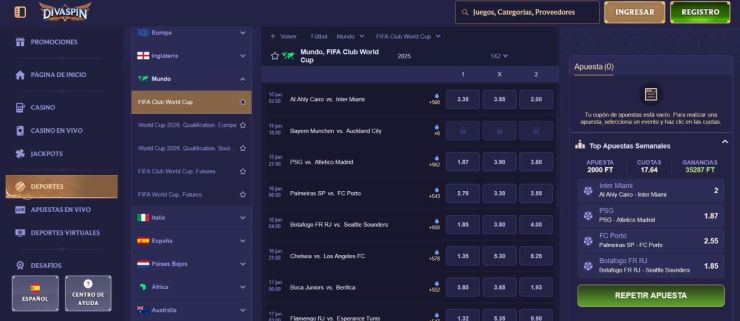 - Diversifica tus apuestas: Combina apuestas al ganador del torneo (como Bayern o Real Madrid) con apuestas a corto plazo, como el resultado de Palmeiras vs Porto.