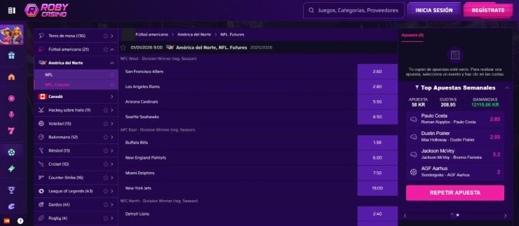 Equipos como los Kansas City Chiefs (AFC Oeste) y los Philadelphia Eagles (NFC Este) atraen muchos pronósticos de la NFL y también de la Super Bowl LX. Por lo general, las apuestas más comunes incluyen el “moneyline”, donde se elige al ganador del partido. Por ejemplo, puedes apostar a los Dallas Cowboys contra los New York Giants.
