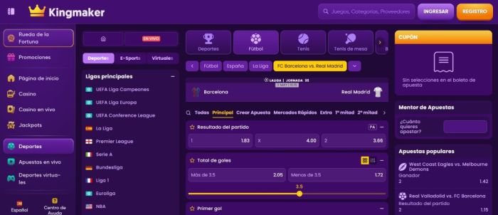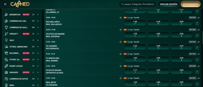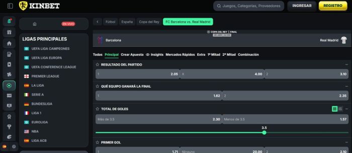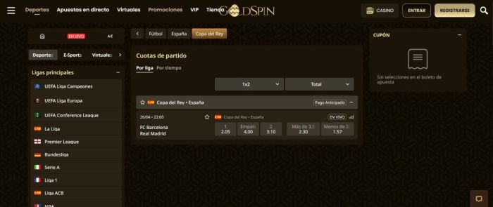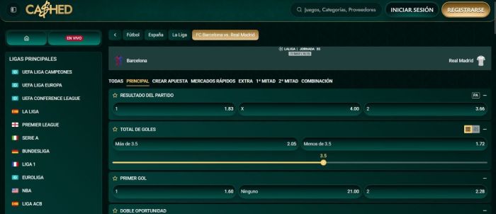 Con todo listo, puedes ir a la sección de deportes y elegir la categoría de fútbol. Luego, busca el mercado español y el partido entre Real Madrid y Barcelona. Cuando elijas este evento, todos los mercados disponibles se desplegarán en tu pantalla.