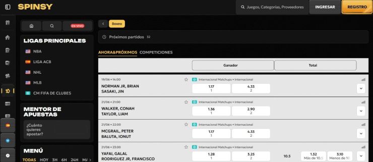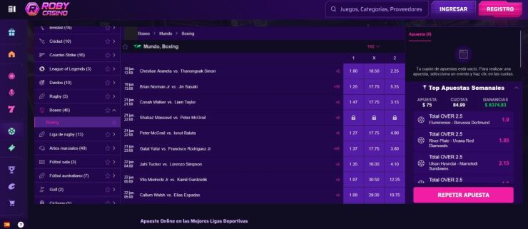 Analizamos si ofrecen apuestas en todos los combates, como Viruzz vs Mazza. Buscamos mercados variados: ganador, asaltos totales o KO, apuestas combinadas y mercados en vivo. Casas como CoinCasino destacan por su amplitud en este sentido, ya que te garantizan opciones para cada combate.