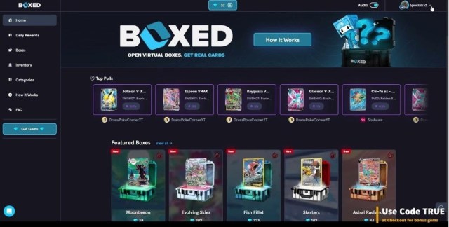BOXED.gg is an online platform that lets users digitally open mystery packs, including Pokémon cards, and view, ship, or trade the cards they receive. With its game-like interface and animated pack-opening experience, the platform is designed to be fun and accessible even for those new to Pokémon cards.