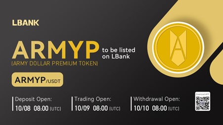INTERNET CITY, DUBAI, Oct. 9, 2022 – LBank Exchange, a global digital asset trading platform, has listed ARMY DOLLAR PREMIUM TOKEN (ARMYP) on October 9, 2022. For all users of LBank Exchange, the ARMYP/USDT trading pair is now officially available for trading.