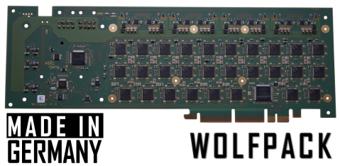 Wolfblood xE inherits all the good features from its predecessor and enhances them: Fine-grained frequency stepping, adaptive voltage control, small footprint and standard IO interfaces all together enable both power-efficient mining at the lowest energy per GH ratio as well as power mining with the highest GH/s density at competitively low power consumption.