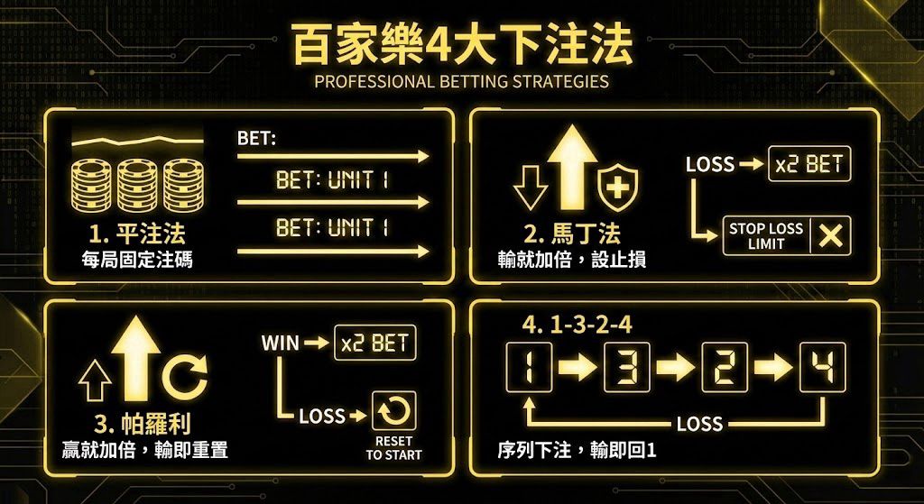 百家樂的發牌無法被操控,下注系統也不會改寫機率,但資金管理可以決定風險如何分布,並影響連敗時的存活率與連勝時的收益效率。平注法提供穩定框架,馬丁格爾帶來高壓回補但必須搭配止損,帕羅利用勝進放大利潤且相對保守,1-3-2-4則以鎖利邏輯取得更平衡的波動表現。