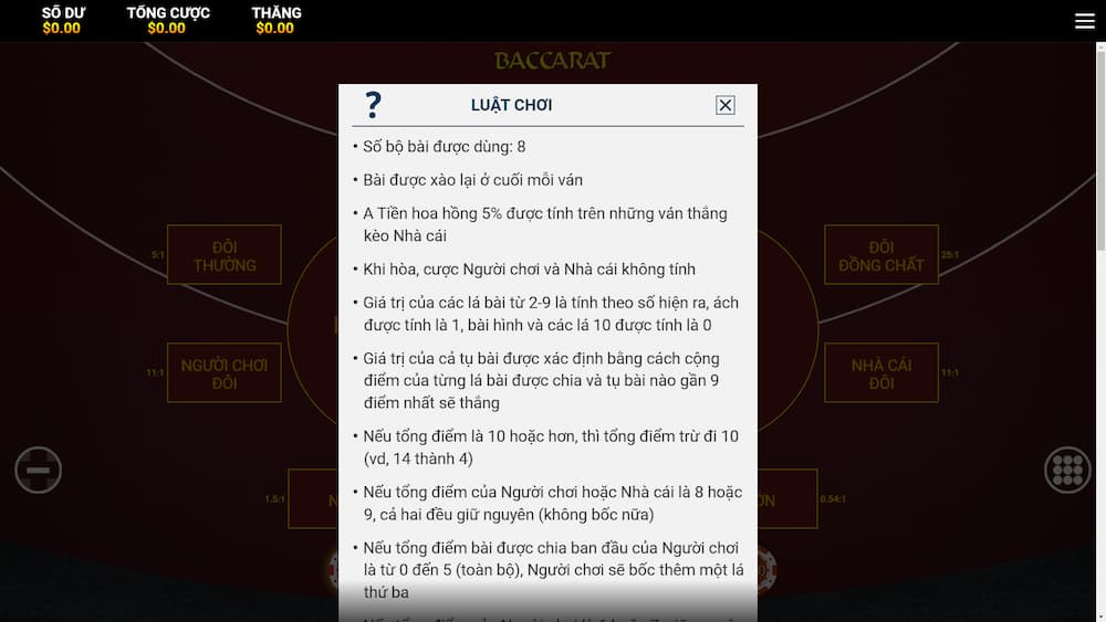 | Natural | Thắng tự nhiên. Chỉ trường hợp Player hoặc Banker thắng với tổng điểm 2 lá bài đầu tiên bằng 8 hay 9 điểm |