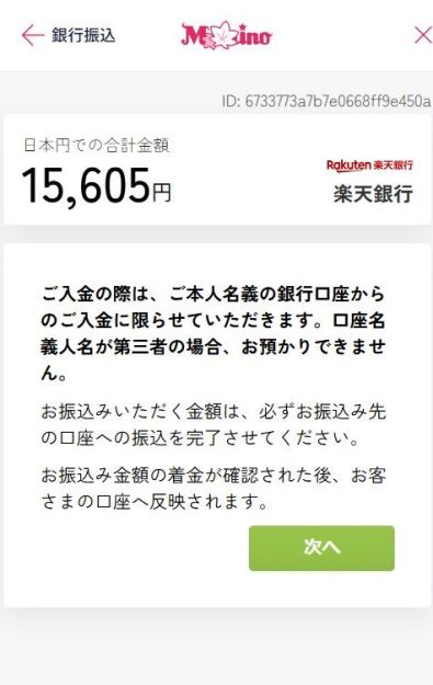 遊雅堂への入金は、登録者本人名義の口座からしか送金することができないので、確認して「次へ」を押します。