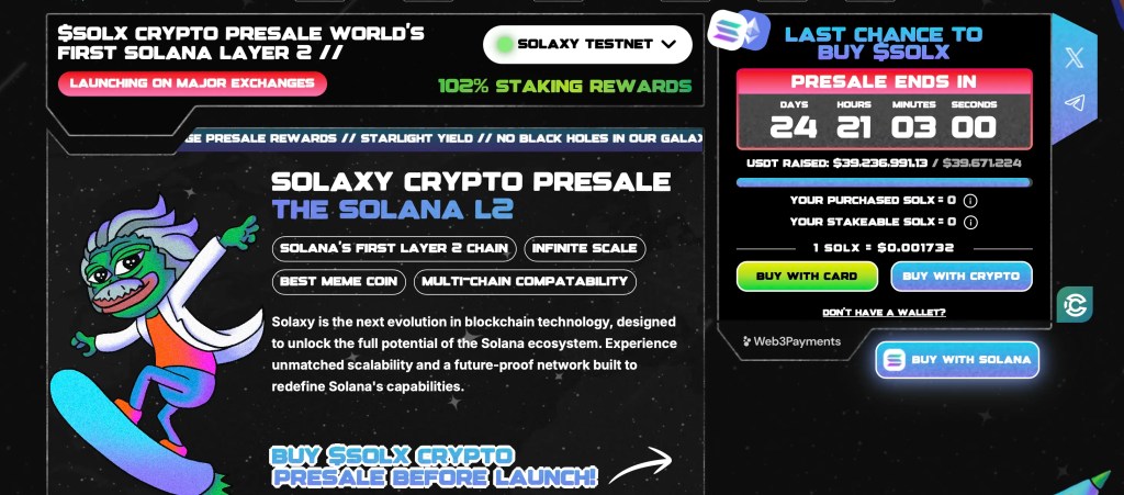 Der native Token von Solaxy ist $SOLX und dieser ist aktuell im Vorverkauf erhältlich. Anleger haben hier also noch die Möglichkeit, zum günstigen Fixpreis einzusteigen, wobei bereits über 39 Millionen Dollar umgesetzt wurden. Das dürfte daran liegen, dass man nicht oft die Gelegenheit bekommt, einen neuen Coin mit neuer Blockchain in einer so frühen Phase zu kaufen.