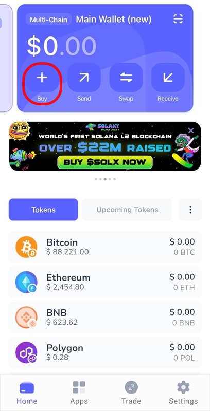 3.1.1) ที่หน้าแรก ให้กดไปที่ปุ่ม Buy ที่วิดเจ็ตกระเป๋าเงินของคุณ (ด้านบน)