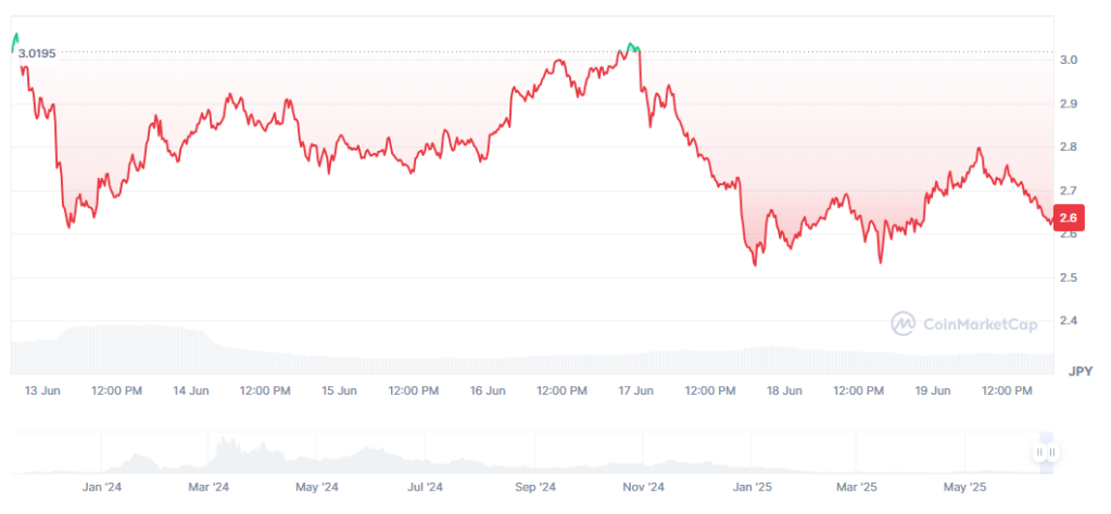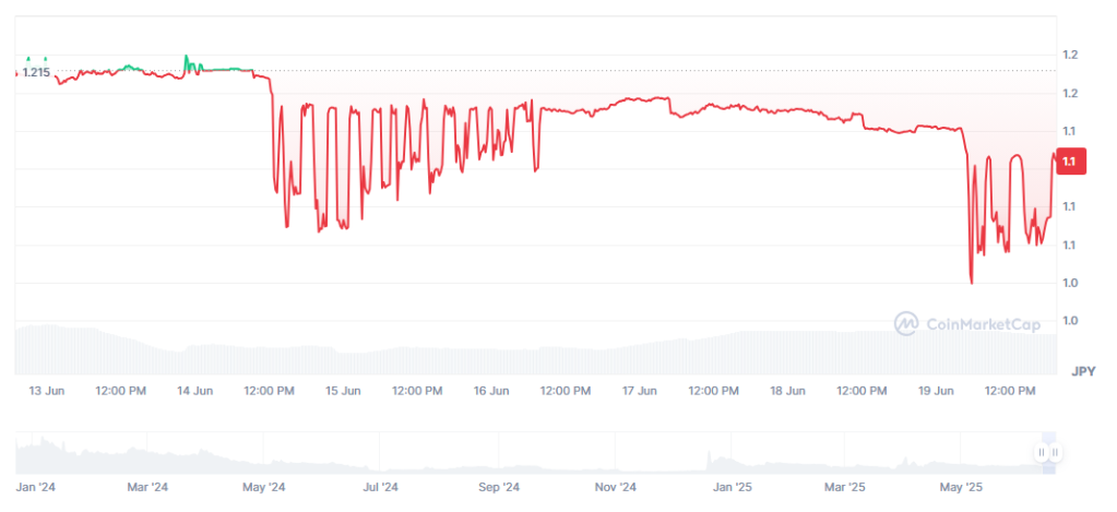2025年3月末には最大で386%の急騰を記録し、4月中旬には取引量が一気に増加した。現在の価格はピーク時から下落しているが、依然として事前価格の57%高の水準にあり、時価総額は約1,600万ドル(約25億円)前後に位置している。