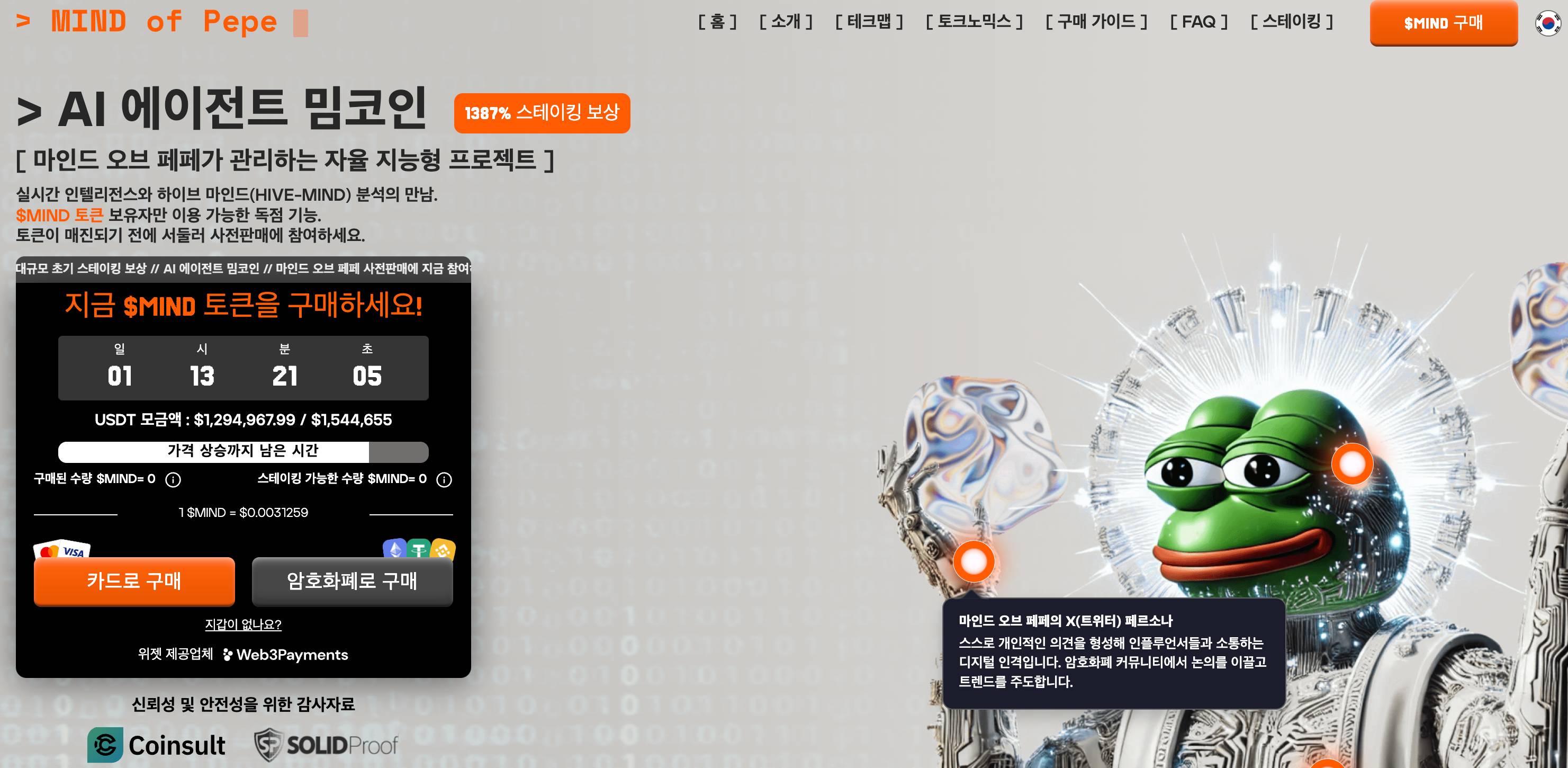 암호화폐 감사 회사인 코인설트와 솔리드프루프가 마인드 오브 페페의 스마트 계약을 면밀히 검토한 결과 아무런 문제가 없는 것으로 평가됐다.
