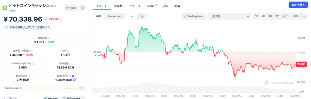 ビットコインが上昇すると、Bitcoin Cash(BCH)も連動して価格が動く傾向にある。市場規模がビットコインよりも小さいことから、上昇率はむしろ大きくなることも多い。