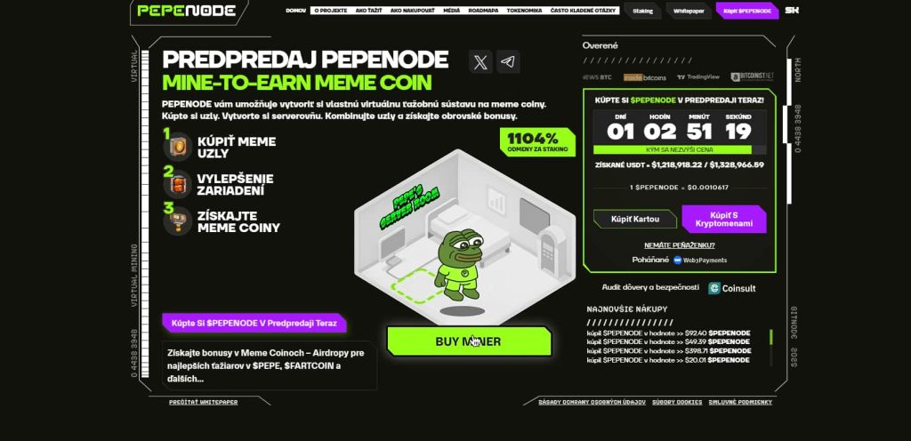 Pepenode je meme coin, ktorý kombinuje prvky ťažby a odmeňovania. Projekt je navrhnutý tak, aby držitelia tokenov mohli získavať bonusy prostredníctvom stakingu a zapájania sa do komunity, čo ho odlišuje od klasických memecoinov založených výlučne na špekulácii.