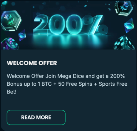 Mega Dice brings together high-octane casino gaming and crypto sports betting with a 200% welcome bonus up to 1 $BTC plus 50 free spins, and one of the most rewarding rakeback systems around.