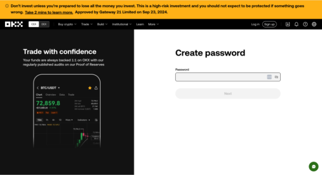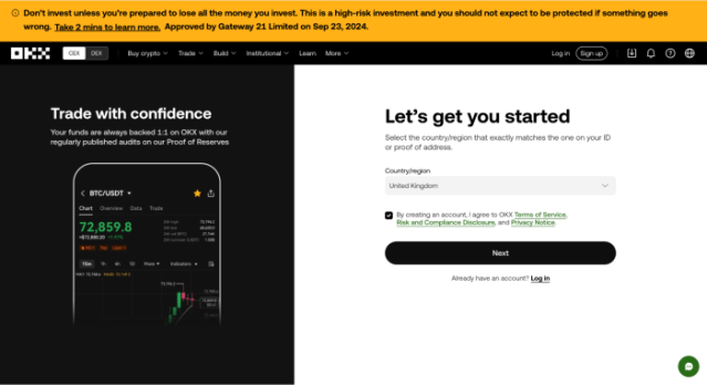 Go to your selected UK crypto exchange and click ‘Sign Up.’ In this example, we’ll be using our top choice, OKX.