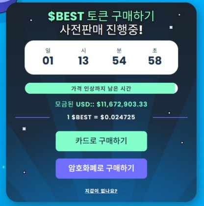 토큰당 0.024725달러이며 프리세일로 1,160만 달러 이상 모금한 $BEST는 메타마스크(MetaMask)와 같이 시대에 뒤처진 주자의 자리를 대신할 차세대 암호화폐 지갑인 베스트월렛의 빠른 성장을 돕는다.