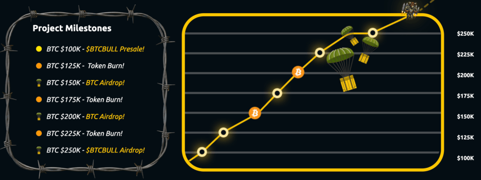نکات بیشتری در مورد این توکن وجود دارد. یکی از ویژگی های برجسته این توکن، سیستم ایردراپ بیت کوین آن است. با رسیدن بیت کوین به نقاط عطف کلیدی – ۱۲۵ هزار دلار، ۱۵۰ هزار دلار و بالاتر – دارندگان $BTCBULL ایردراپ های $BTCBULL و $BTC دریافت خواهند کرد.